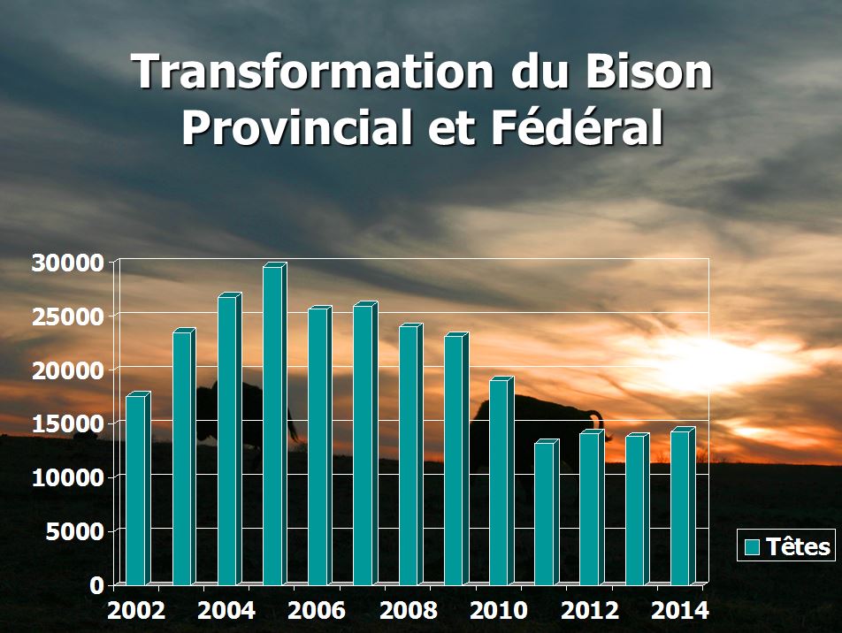 En 2001, les troupeaux de bisons canadiens ont dépassé les 200 000 animaux. Le cheptel total a plus que doublé entre 1996 et 1999, et triplé au cours de la période allant de 1996 à 2001. (1) Ces augmentations donnent à croire que ce nombre aurait pu presque doubler de nouveau pour atteindre 392 000 en 2004. Les sujets destinés à la mise en marché, principalement des mâles de 2 ans et des bisons de réforme, ont connu une croissance légèrement plus lente que le troupeau total en général. Les bisons mis en marché sont passés de 5 800 en 1996, à 8 381 en 1999, soit un taux de croissance de 1,4. Quelque 12 000 bisons ont été mis en marché en 2000. Ce nombre a augmenté progressivement par la suite pour atteindre un sommet de 30 000 animaux abattus en 2005. Suite à la période de restructuration de 2002 à 2008, ce nombre s’est stabilisé à environ 14 000 têtes depuis 2011.